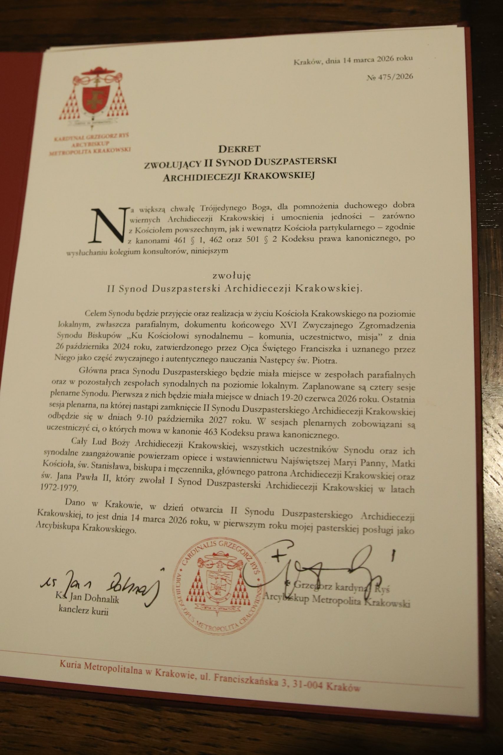 Po homilii metropolita krakowski odczytał i podpisanie Dekretu zwołujący II Synod Duszpasterski Archidiecezji Krakowskiej.