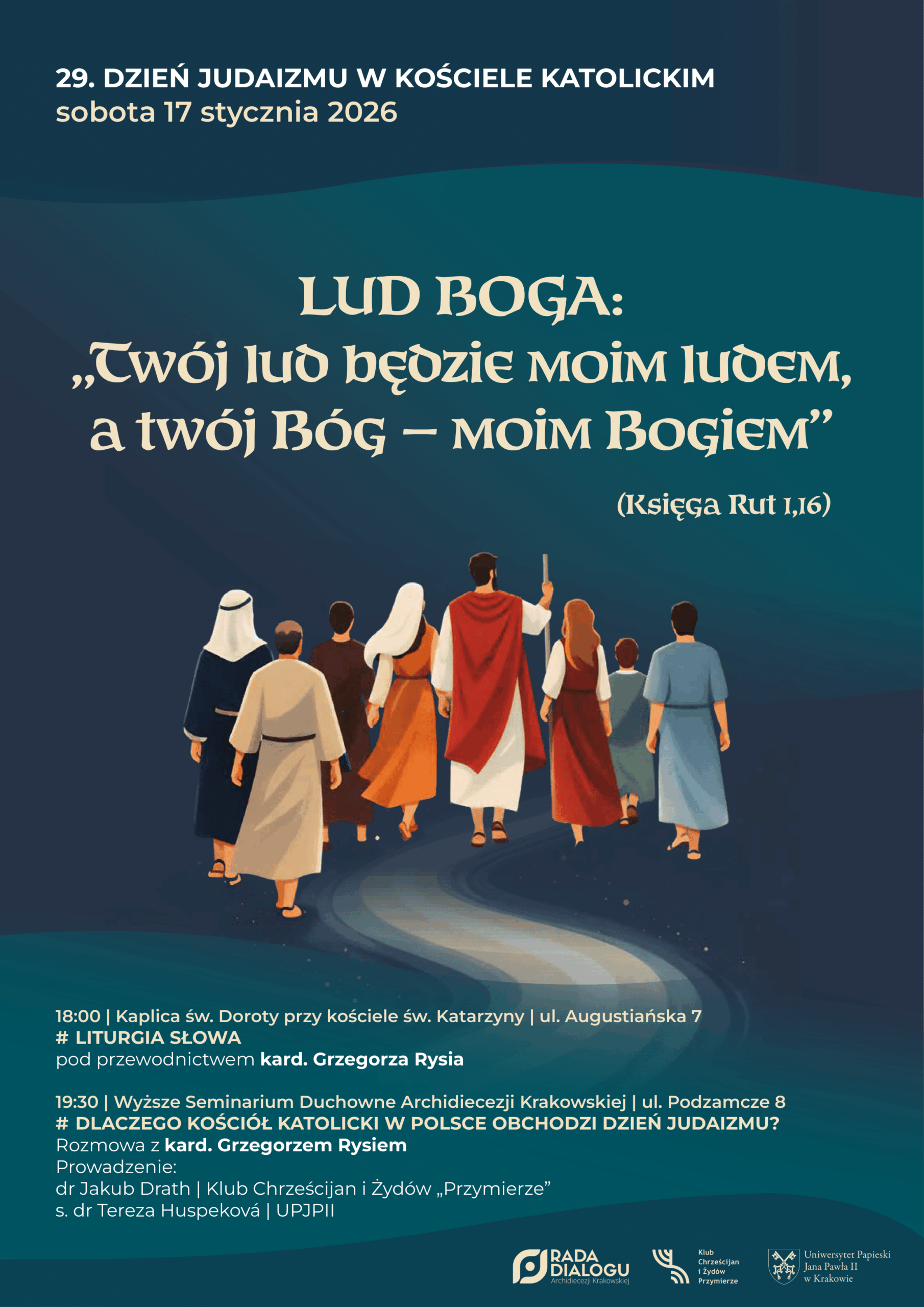 W sobotę, 17 stycznia kard. Grzegorz Ryś weźmie udział w archidiecezjalnych obchodach XXIX Dnia Judaizmu w Kościele katolickim. Rozpocznie je nabożeństwo o godz. 18.00 w kaplicy św. Doroty przy kościele św. Katarzyny Aleksandryjskiej w Krakowie, którego kontynuacją będzie spotkanie w budynku Wyższego Seminarium Duchownego Archidiecezji Krakowskiej. Wydarzeniu towarzyszy hasło „Twój lud będzie moim ludem, a twój Bóg – moim Bogiem” (Biblia Ekumeniczna, Księga Rut 1,16).